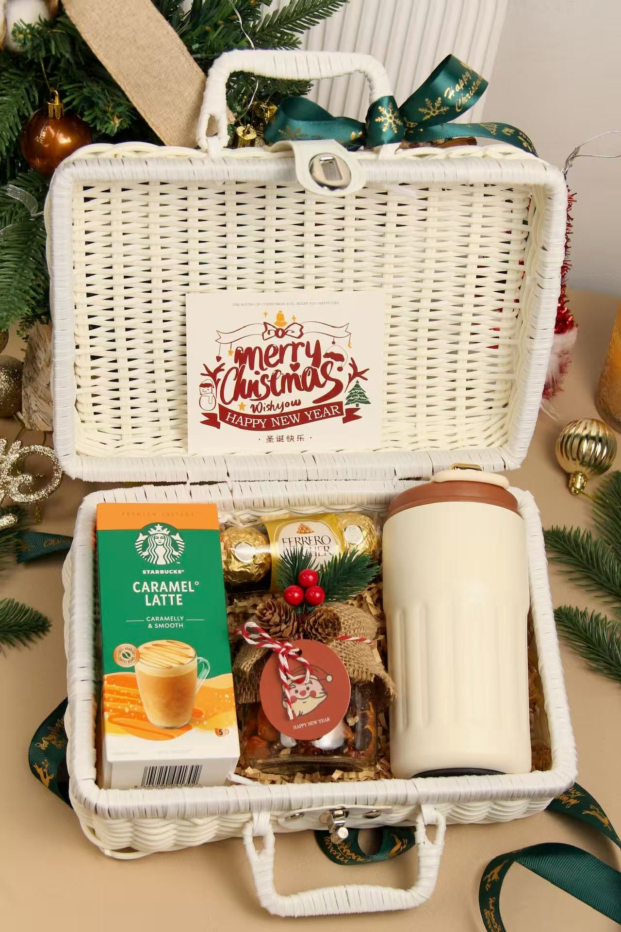 A stylish rattan basket thoughtfully curated to share festive warmth and appreciation with clients, partners, or colleagues. Featuring a sleek thermos, gourmet nuts, Starbucks coffee, and indulgent gold chocolates, it’s a tasteful way to celebrate the holiday season.